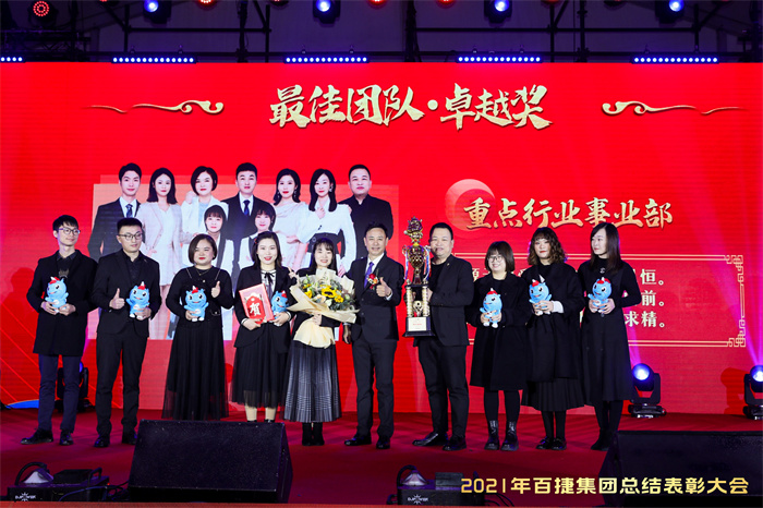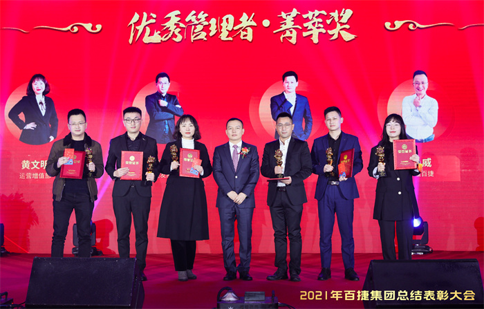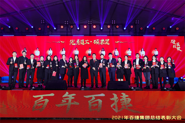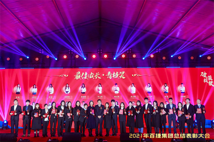一路芳華,共耀星輝。夢想是為目標一次次的全力以赴。百捷18年崢嶸歲月,每位家人都鉚足了勁兒,正因為有一群群的百捷人勇敢筑夢,才有了今天的璀璨星光,在2021變局之年中更綻放出了更多的榜樣力量。頒獎典禮現場,集團領導為獲獎人員頒發了“最佳成長·青枝獎“、“優秀員工·碩果獎”、“職業精神·耕耘獎”、“優秀管理者·菁萃獎”、“文化先鋒·踐行獎”、“亮劍勇士稱號”、“最佳團隊·卓越獎”。
